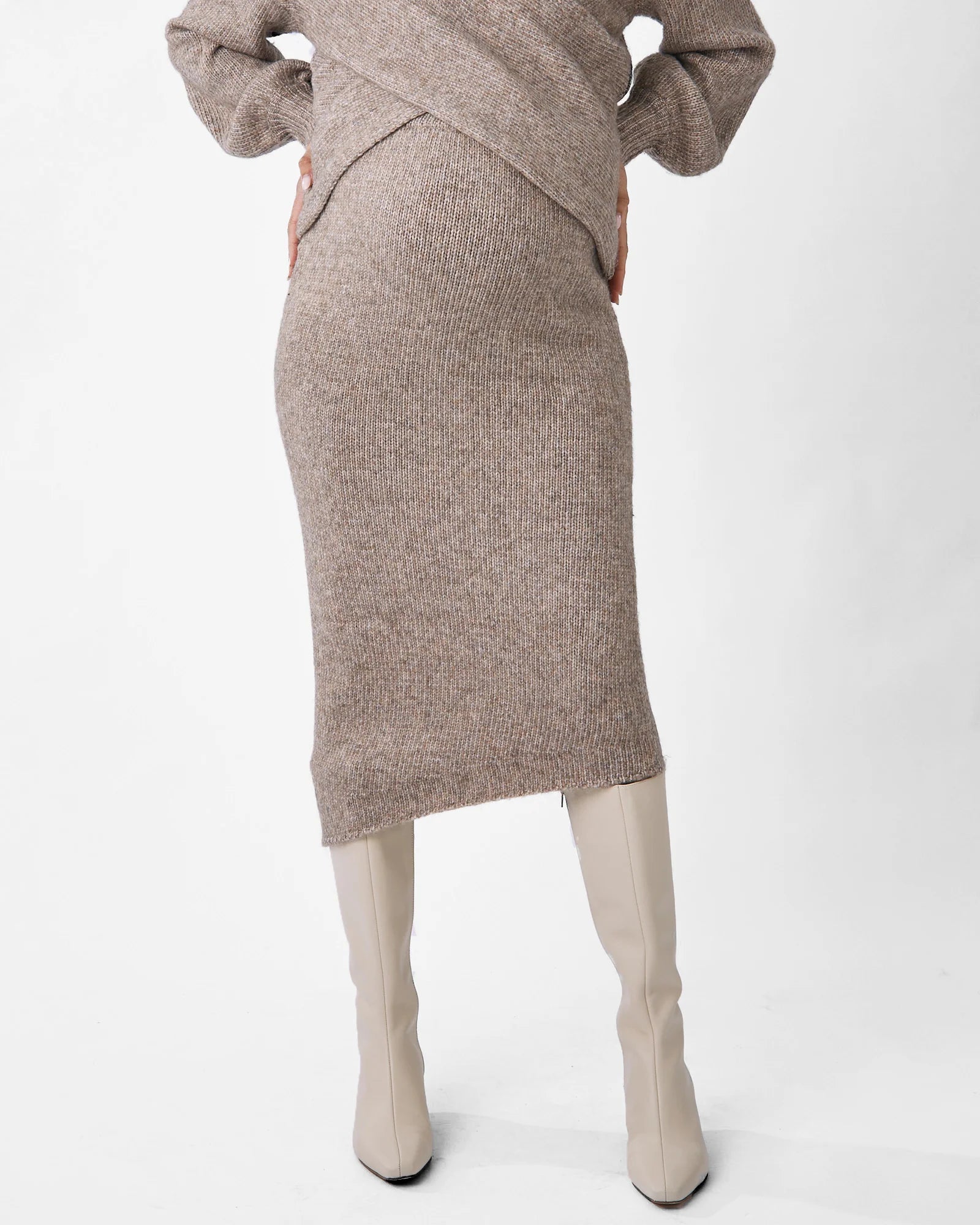 The Amélie's Enchanting Allure Asymmetrical Knit Midi Skirt in taupe is a chic and sophisticated skirt featuring a soft knit fabric, an asymmetrical hemline for a modern touch, and a flattering midi length, perfect for adding a touch of elegance to any outfit.