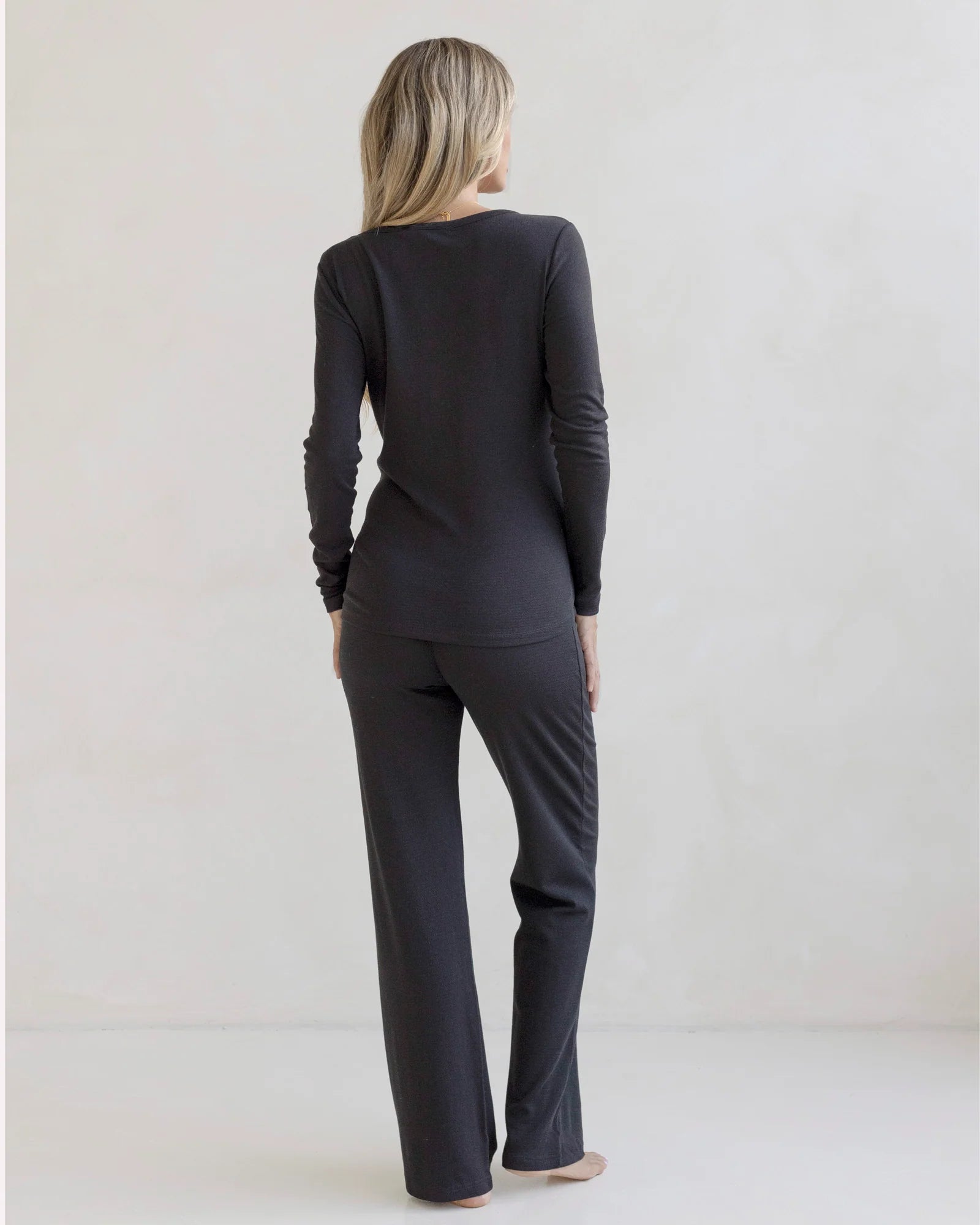Lounge in serenity with the Amira Set, designed for both comfort and convenience. Crafted from a luxuriously soft modal-cotton blend, this set includes a button-down top for easy breastfeeding access and high-waisted pants that gently support your growing bump.