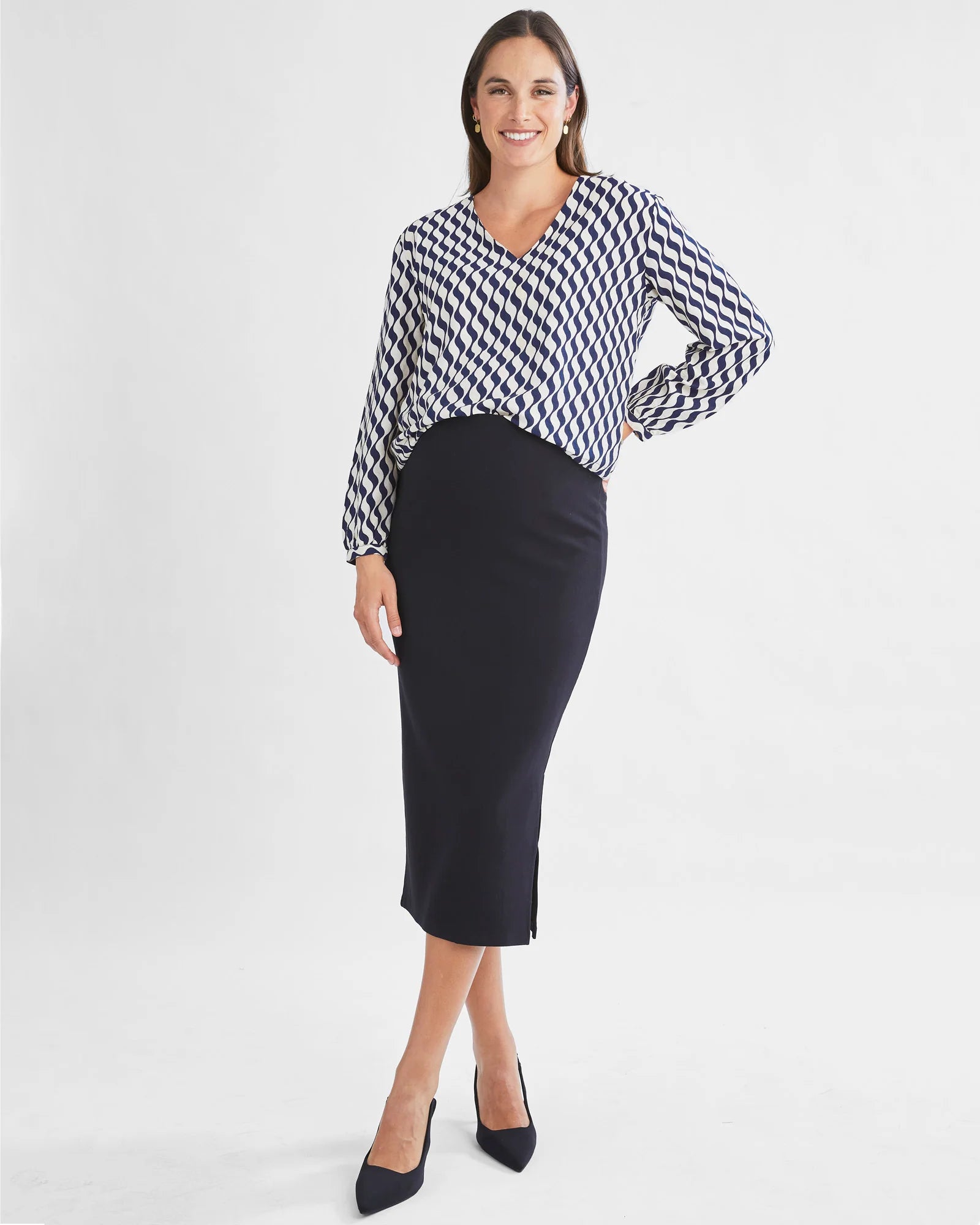 This chic blouse features a geometric wave pattern in a timeless blue and white combo. With a classic V-neck and long sleeves, it offers a perfect blend of style and practicality. The lightweight, soft fabric ensures all-day comfort, making it ideal for working moms. Pair it with skirts or trousers to add confidence and professionalism to your look.